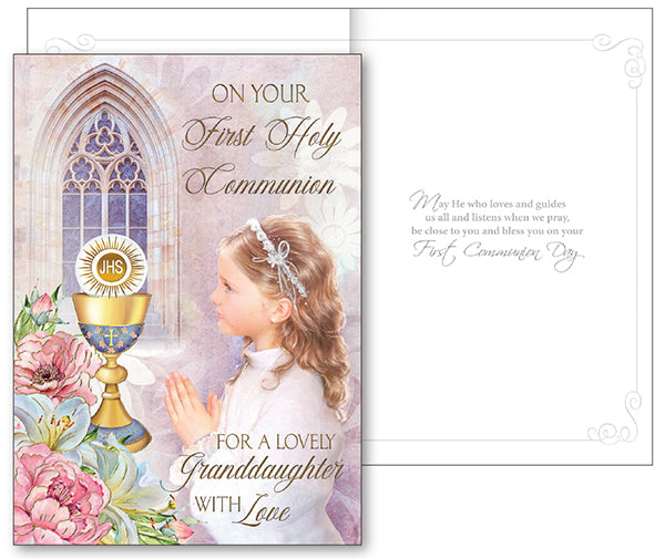 Celebrate your grand daughter's First Communion with this beautiful and thoughtfully designed Christian Communion holy card. Featuring an insert and individually wrapped for protection, this card serves as a timeless keepsake. The heartfelt message inside speaks of love, faith, and blessings, making it a perfect gift to mark this sacred milestone.