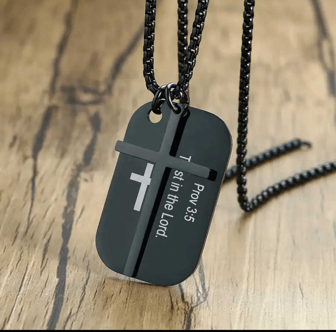 The sleek black stainless steel design ensures these necklaces are versatile enough for any occasion, while their durable construction guarantees long-lasting wear. Whether for daily wear or special events, these dog tag necklaces will make a bold statement of faith.