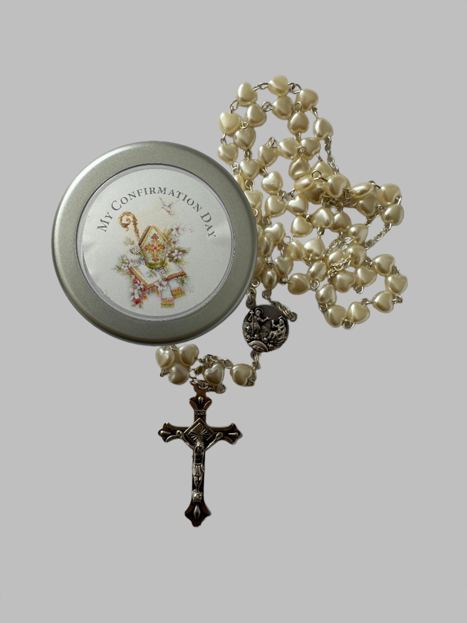 Celebrate the sacred milestone of Confirmation with our beautifully designed heart-shaped bead rosary. Each 6 x 6 mm bead is made from high-quality imitation pearls, offering a classic and elegant look. The durable acrylic material ensures the rosary will last for years, making it a cherished keepsake to honor this spiritual journey.
