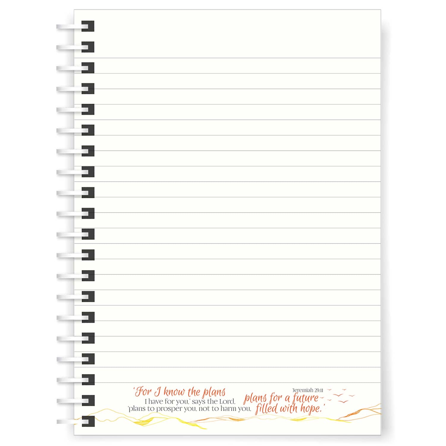 Featuring a striking laminated cover with golden mountains, this notebook includes 160 lined pages, each printed with the empowering words of Jeremiah 29:11: “For I know the plans I have for you,” says the Lord, “plans to prosper you, not to harm you, plans for a future filled with hope.”